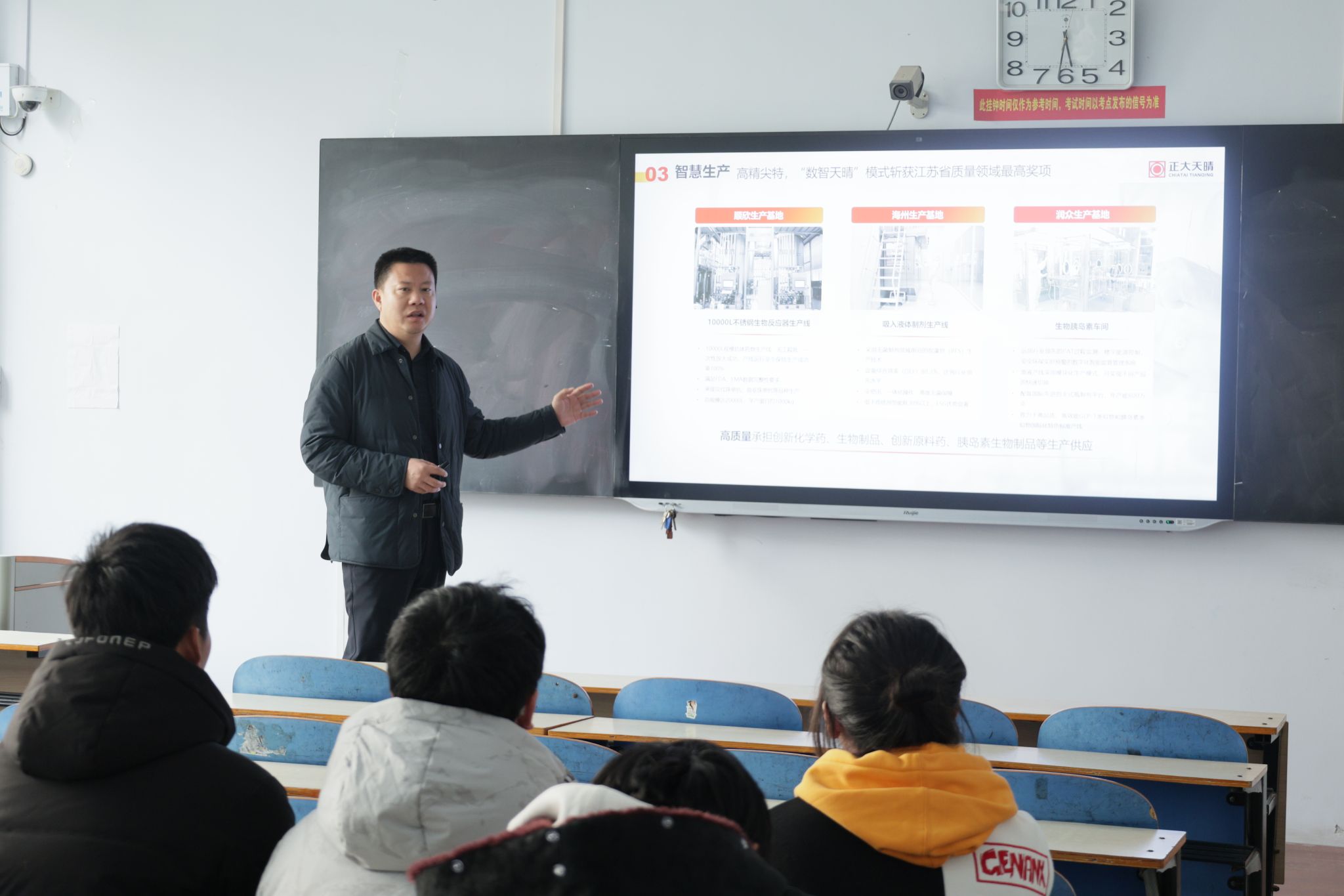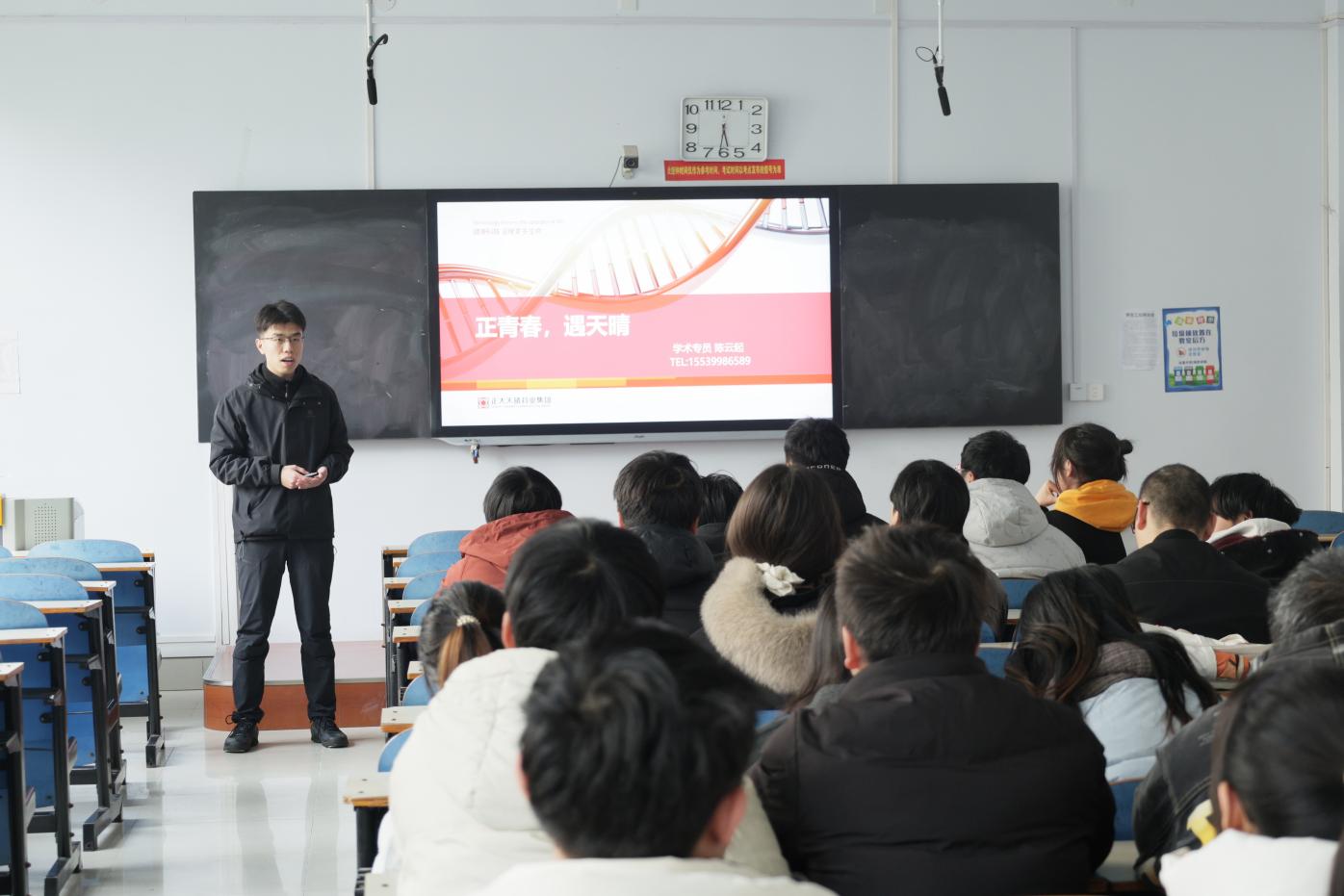 宣讲会上,陈云起介绍了正大天晴药业集团发展历程。从 1969 年建厂初期的艰苦创业,到如今成为医药行业领军企业,集团五十余年来深耕不辍,在品牌建设、战略转型与创新研发领域取得卓越成就。他深入阐释了企业"科技兴国、产业报国"的使命愿景,结合医药行业发展趋势,详细解读了企业在多个核心治疗领域的业务布局。针对学生关注的职业发展问题,陈云起通过生动案例,阐述了核心岗位的职能要求与发展前景,帮助在场学生对医药行业职业生态形成直观认识。现场气氛热烈,同学们纷纷表示对未来的职业路径有了更清晰的规划与信心。
