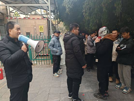 在演练过程中,宋老师展示了他的专业能力和技巧,现场讲解了如何迅速穿戴防护装备,正确使用灭火器等器材进行灭火。同学们纷纷上前进行实操演练,随着尖锐的警报声响起,教学楼中浓烟迅速扩散开来,同学们在老师的指导下,用湿毛巾捂住口鼻,从楼内迅速而有序的疏散到楼下安全地带。整个演练过程紧张而有序,老师根据实际情况做出了及时的调整,并指导各个小组进行协作。