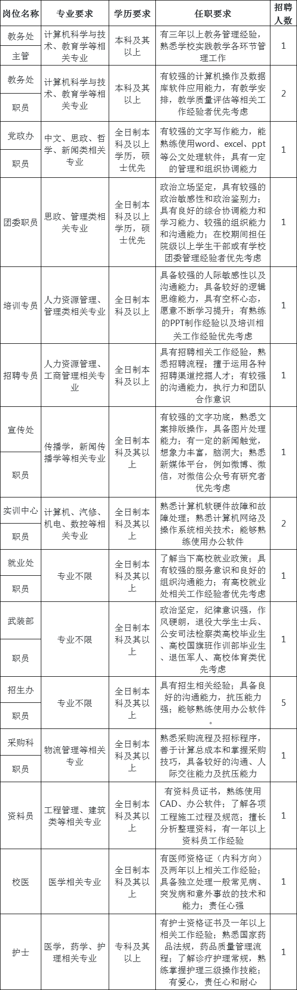 学校现面向社会引进高层次人才、学科带头人,招聘各专业教师和行政岗人员。