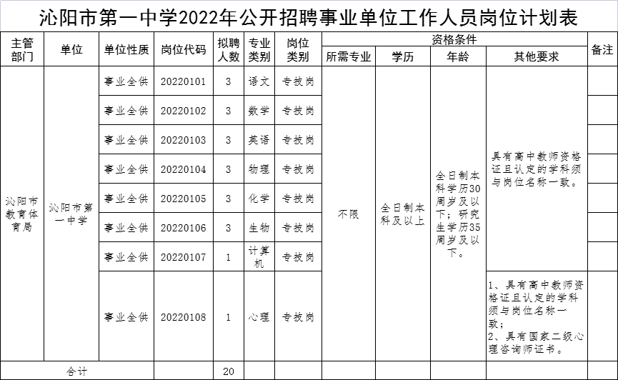 本次计划招聘教育类岗位事业单位工作人员20名,具体招聘计划和岗位要求等相关内容详见附件1。
