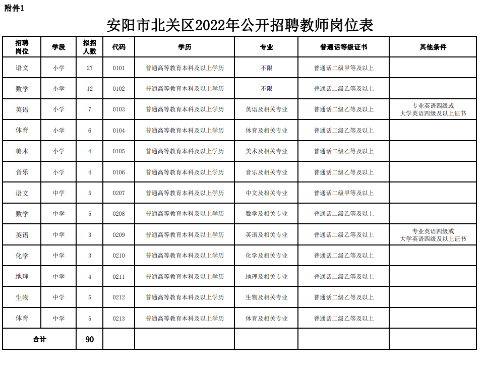 为进一步优化教师队伍结构,提高教育教学质量,促进教育事业的健康发展,根据《事业单位公开招聘人员暂行规定》(人事部2005年第6号令)、《事业单位人事管理条例》(中华人民共和国国务院令第652号)、《河南省事业单位公开招聘工作规程》(豫人社〔2015〕55号)、《关于进一步加强和改进事业单位公开招聘工作的意见》(豫人社事业〔2016〕4号)、《关于进一步深化人事制度改革加强教师队伍建设的若干意见》(豫人社〔2019〕16号)等有关文件规定及上级有关精神,经区委、区政府研究同意,按照“公开、平等、竞争、择优”的原则,决定面向社会公开招聘教师90名(中学30名、小学60名)。现将有关事项公告如下: 一、招聘范围、对象和条件 (一)招聘范围及对象 具体招聘岗位、学段、数量等详见《安阳市北关区2022年公开招聘教师岗位表》。 (图片可放大查看)