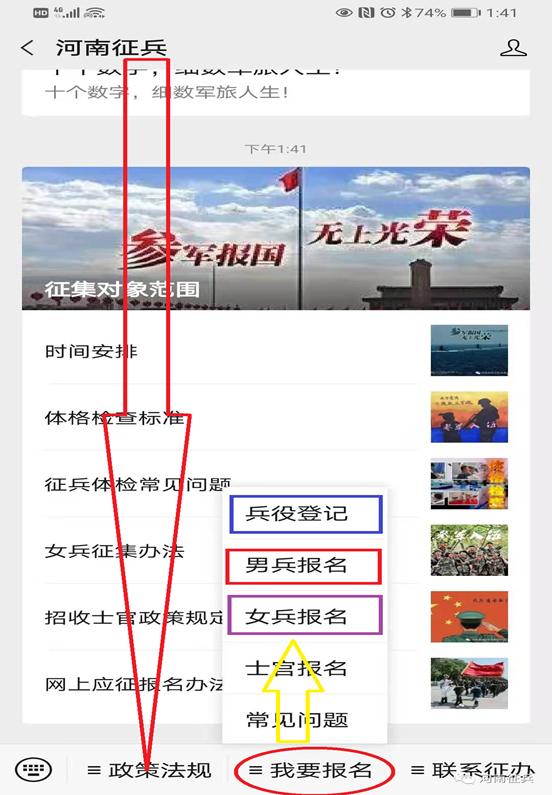 方式一:关注并进入微信公众号“河南征兵”,点击下方菜单“我要报名”