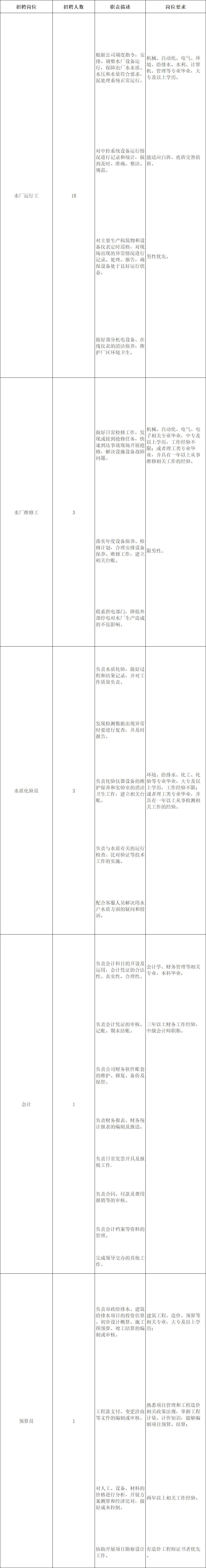水厂运行工18人,水厂维修工3人,水质化验员3人,会计1人,预算员1人。