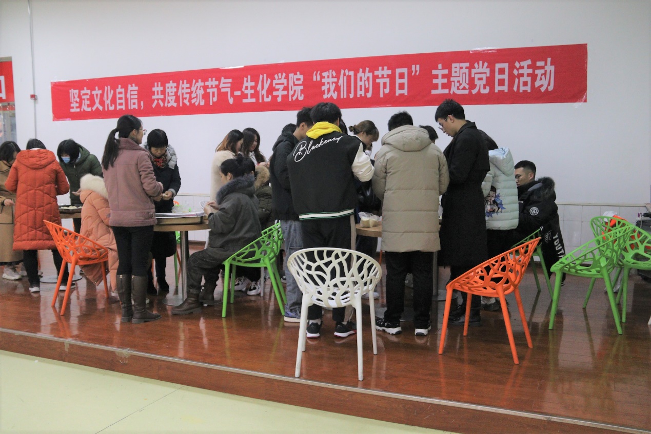 本网讯(特约记者/路守通 学生通讯员/苏杰 朱辉午)12月21日下午,生化学院于学苑餐厅一楼举办“坚定文化自信,共度传统节气”主题党日活动。生化学院全体师生党员参加本次活动。