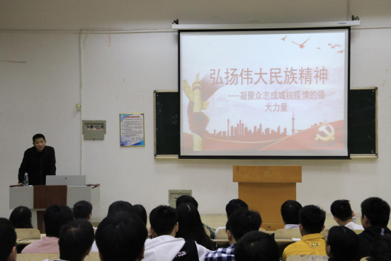 23日,团学办主任尹卓然以“弘扬伟大民族精神,凝聚众志成城疫情的强大力量”为题展开讲述。他说,“艰难困苦,玉汝于成”。面对疫情,面对灾难,广大人民群众众志成城、团结奋战,各级党组织和广大党员干部坚守岗位、靠前指挥,身先士卒、带头冲锋,勇于奉献,敢于承担各种急难险重的艰巨任务,让党旗在防控疫情斗争一线高高飘扬。我国上下一心抗击疫情的伟大民族精神也充分响应了习近平总书记在“最强战略”中提出的、要求党员和政府增强“四个意识”、坚定“四个自信”、做到“两个维护”的重要指示。