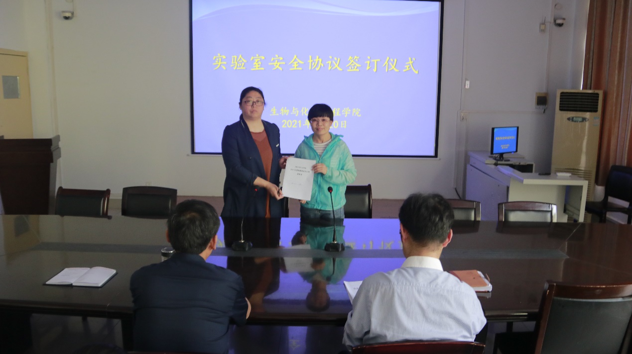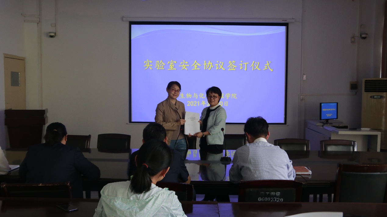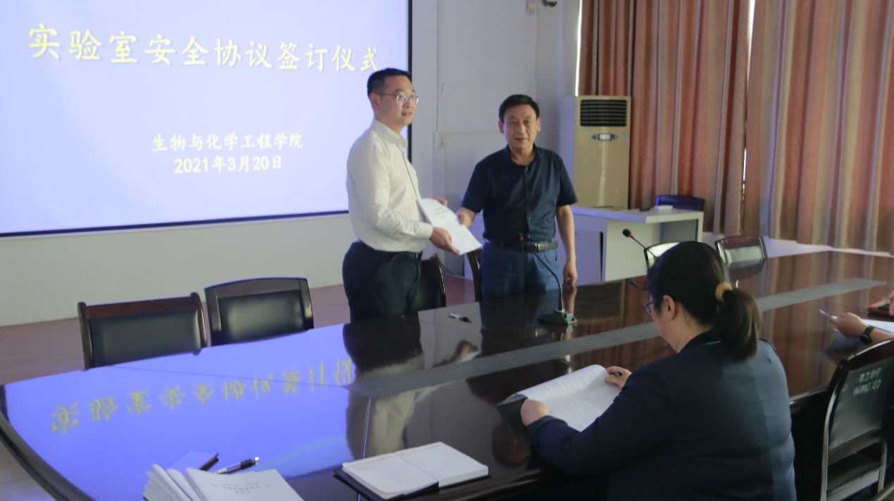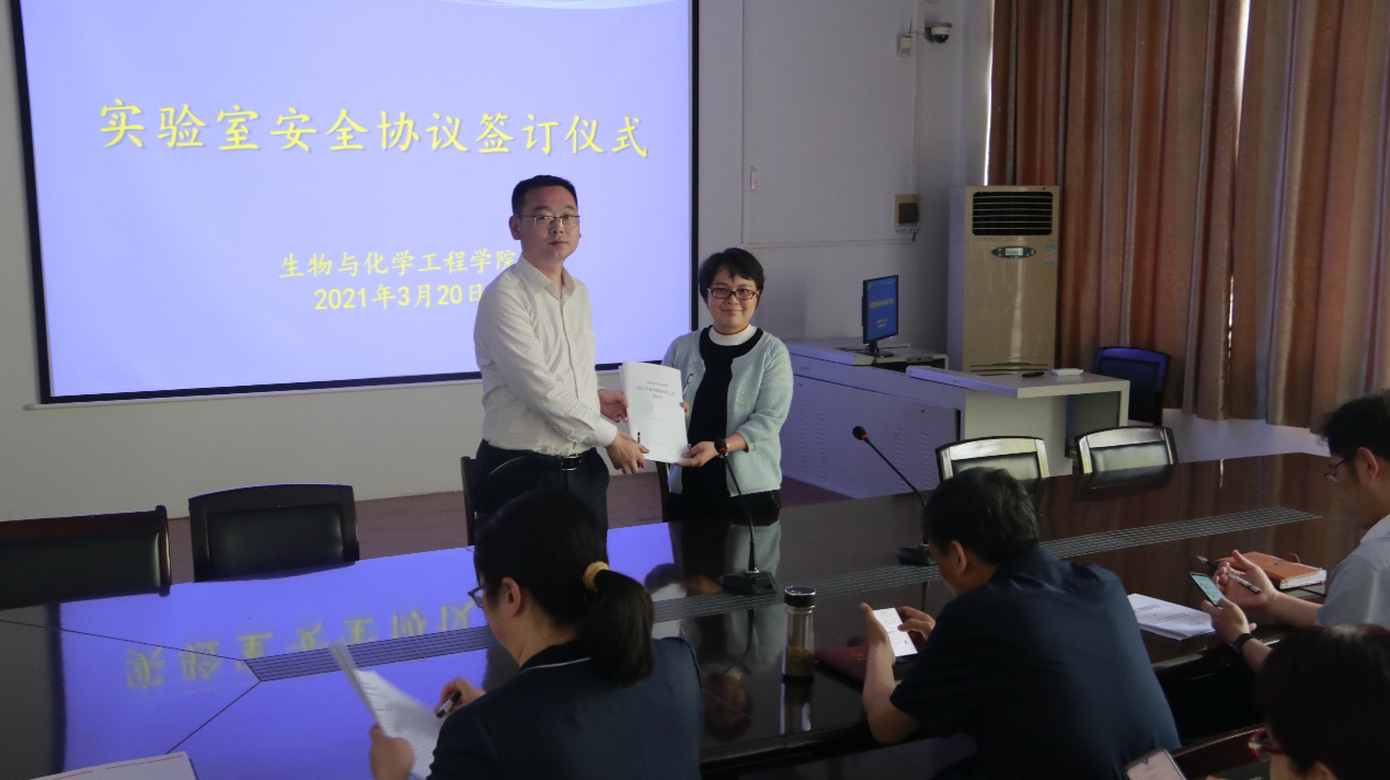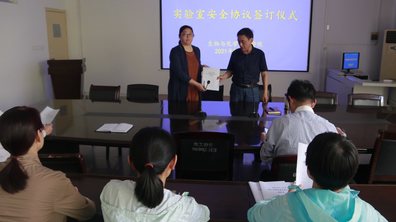 3月20日下午,生物与化学工程学院2021年度实验室安全工作责任书签订仪式在9225会议室举行。生化学院院长罗建成、党委书记康磊、副院长刘学国、河南省工业微生物资源与发酵技术重点实验室副主任程爽、王莹、综合实验实训中心负责任人李焕新及实验室管理教师代表参加本次活动。会议由院长罗建成主持。