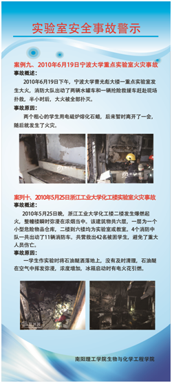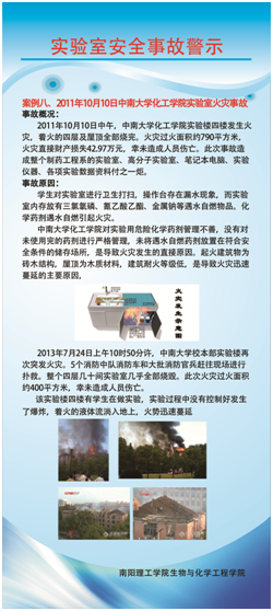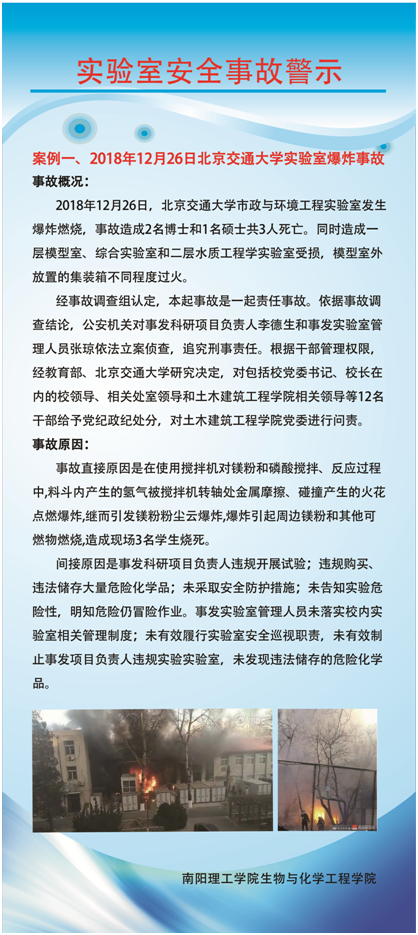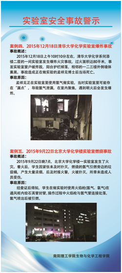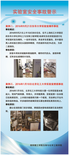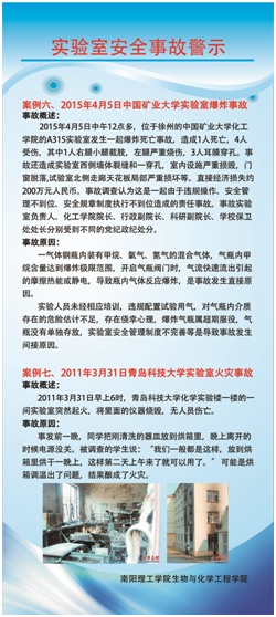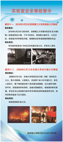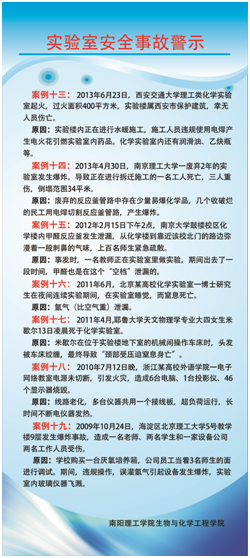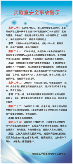 近年来高校化学实验室安全事故频发,造成了严重的人员及财产损失,影响了正常的教学、科研、工作和学习秩序,并且产生了不良的社会影响。在对事故原因的分析中发现,高达98%大学实验室安全事故是人为因素引起的,这包括不安全行为(凡不知、不顾、不理、不能、粗心、迟钝、疲劳、失检、情绪,各种内在外在的行为)和不安全环境(工作场所中,工作环境、设备设施对人所产生之危险因素)。他山之石,可以攻玉,期待我院师生能够切实从这些事故中吸取教训,增强安全防范和责任意识,提高安全防护技能,杜绝在实验过程中安全事故的发生,共同创造和维护安全、和谐、文明的教学、科研环境。