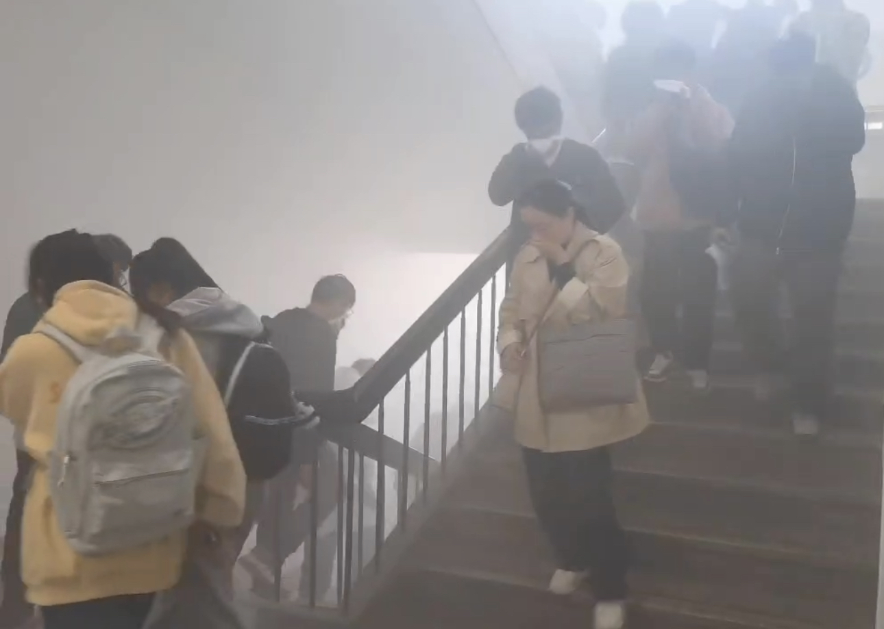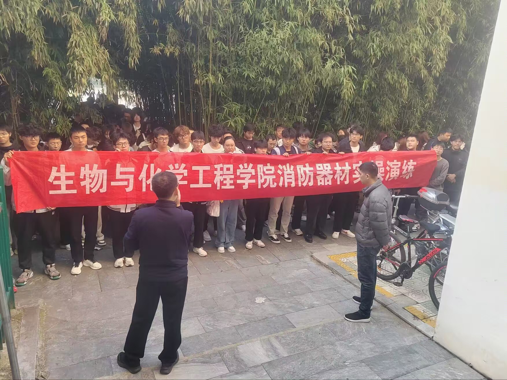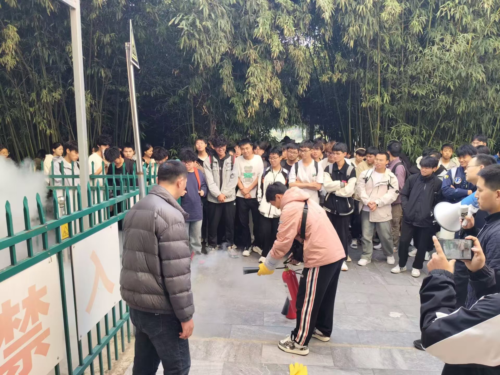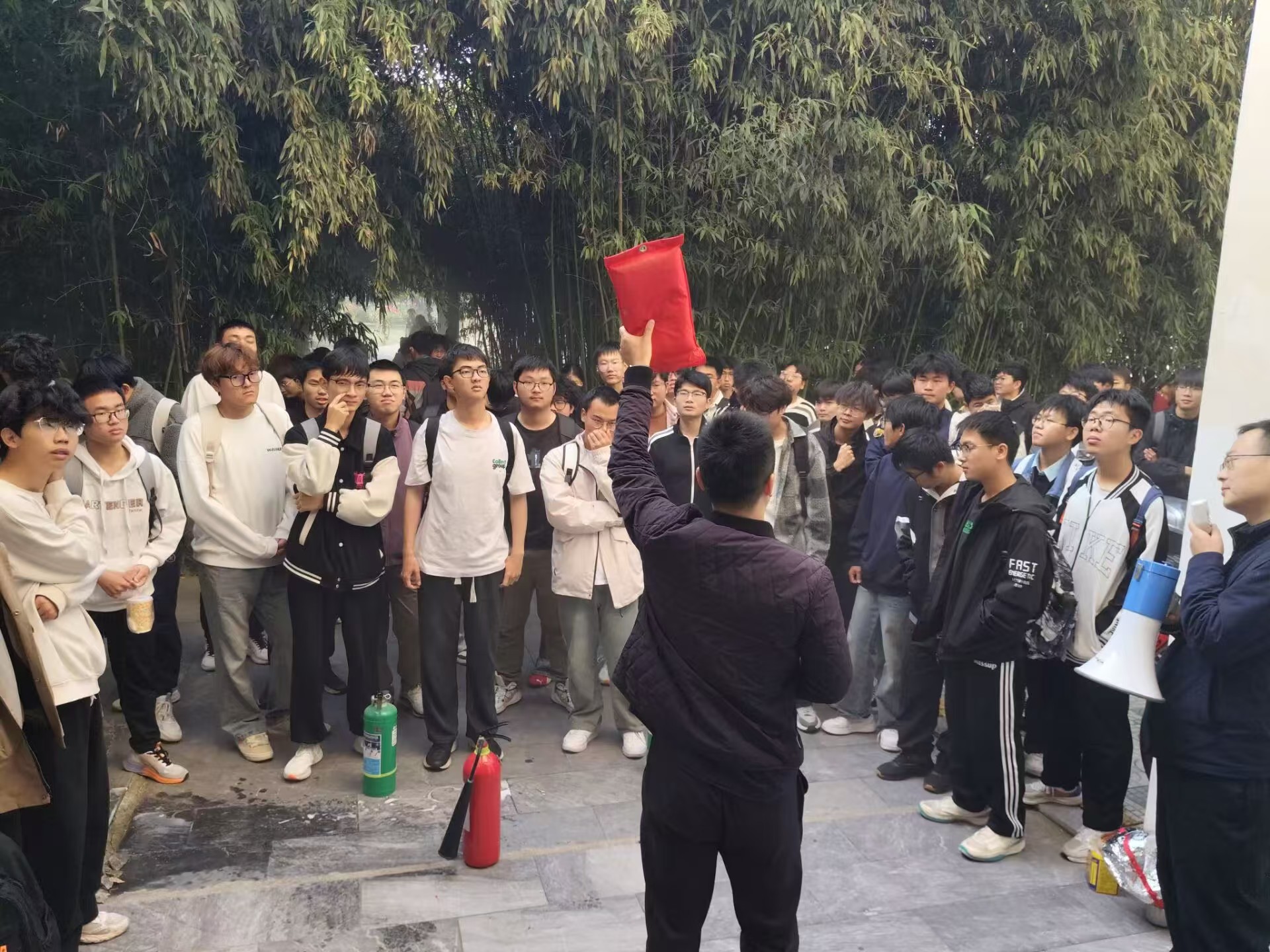 在演练过程中,宋老师现场指导如何迅速穿戴防护装备,正确使用灭火器等器材进行灭火,同学们纷纷上前进行实操演练。随着教学楼内烟雾弥漫,楼内100多名师生在综合实验实训中心老师的指导下,用湿毛巾捂住口鼻,从楼内迅速而有序的疏散到楼下安全地带。