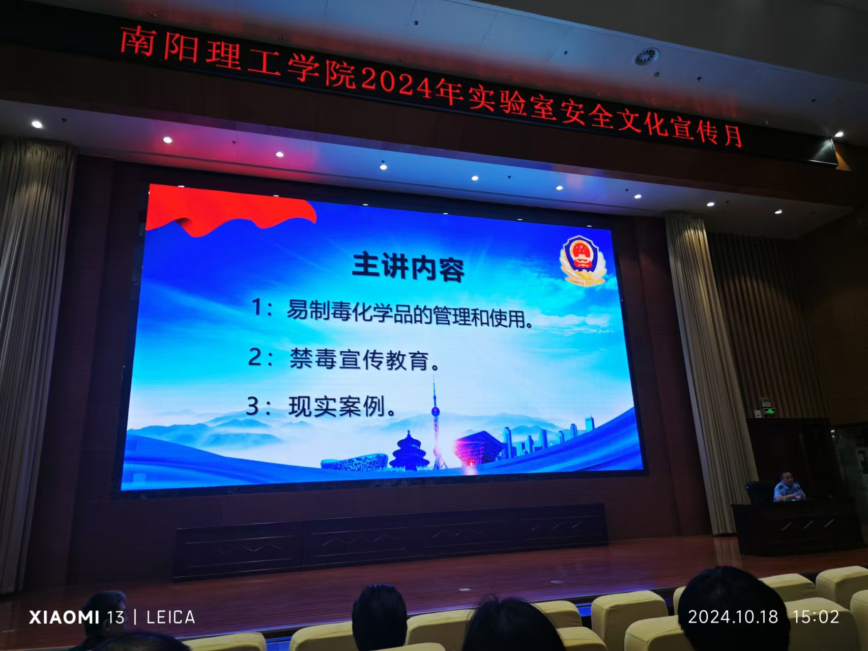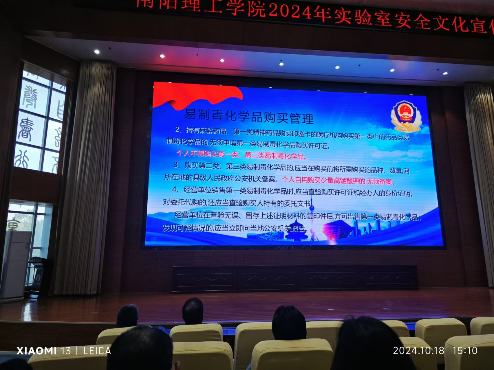 为深入贯彻落实学校实验室安全文化宣传月活动相关精神,进一步加强生化学院各实验室安全管理,消除安全隐患,确保校园安全稳定,20241018日,特别邀请南阳市公安局示范区公安分局禁毒大队中队长郭万军,开展实验室易制毒化学品安全管理和使用专题讲座。