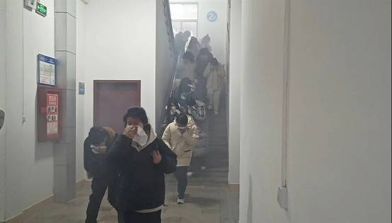 在演练过程中,宋老师展示了他的专业能力和技巧,现场讲解了如何迅速穿戴防护装备,正确使用灭火器等器材进行灭火。同学们纷纷上前进行实操演练,随着尖锐的警报声响起,教学楼中浓烟迅速扩散开来,同学们在老师的指导下,用湿毛巾捂住口鼻,从楼内迅速而有序的疏散到楼下安全地带。整个演练过程紧张而有序,老师根据实际情况做出了及时的调整,并指导各个小组进行协作。