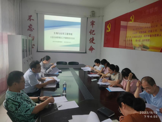 2023年9月12日,生物与化学工程学院副院长刘学国,重点实验室主任程爽,综合实验实训中心主任宋伟及全体大型仪器管理教师举行了大型仪器管理工作讨论会。