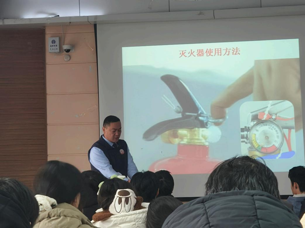 在讲解灭火器使用时,他围绕 “提、拔、握、压” 核心步骤,进行细致演示,强调操作规范与安全距离把控,让师生直观掌握灭火器实操要领。同时,针对校园生活中常见的违规用电、私拉乱接电线等隐患行为,他结合案例警示,呼吁师生树立 “安全无小事” 责任意识,从日常点滴杜绝火灾风险,为师生筑牢消防安全理论根基。