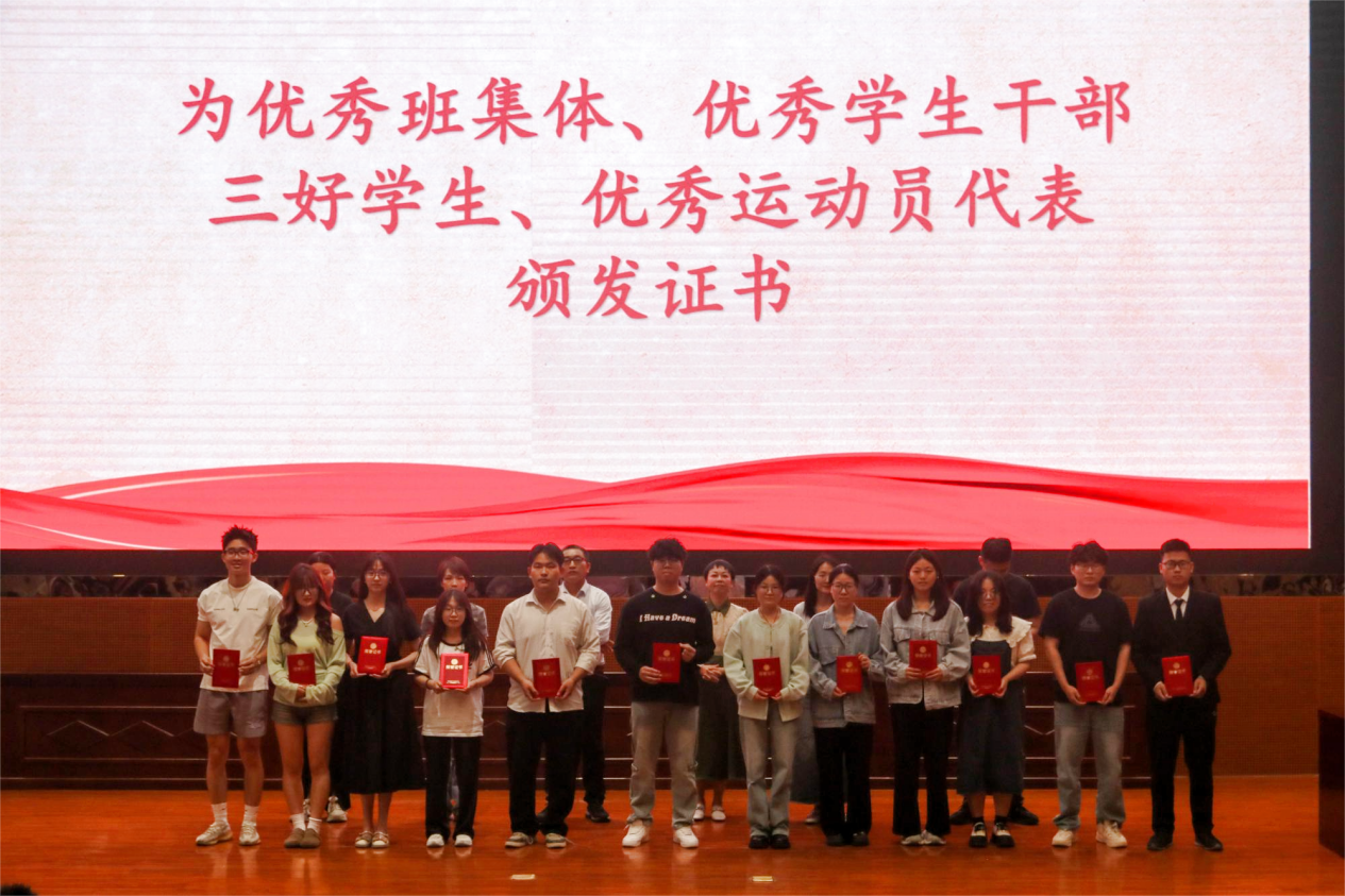 李冉宣读我院获得校2024年先进班集体、三好学生、优秀学生干部荣誉学生名单。张梦宣读2025年运动会成绩及获奖运动员名单。学院领导及相关教师为2024年先进班集体、优秀学生干部、三好学生、2025年优秀运动员代表颁发证书并合影留念。