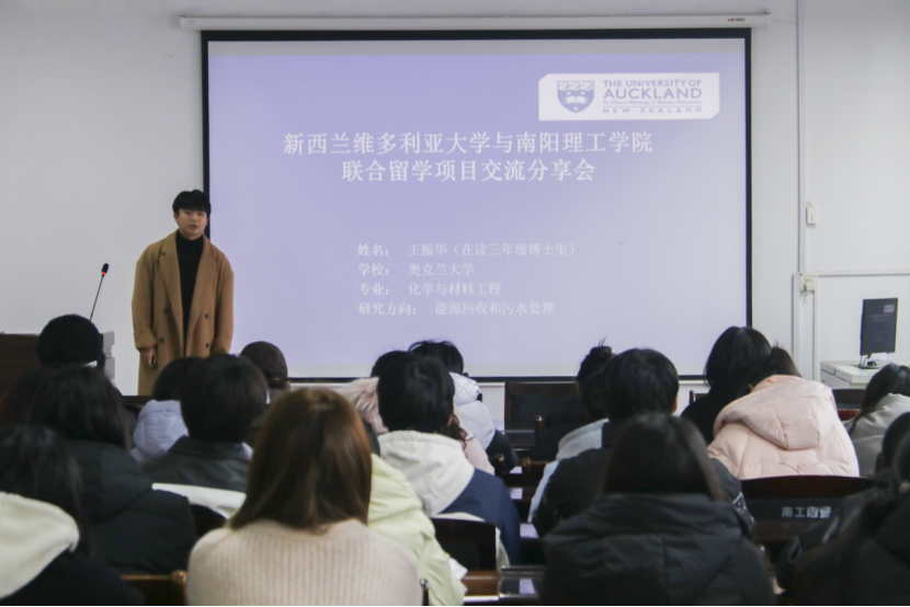 王振华从课程安排、城市特点、学校生活以及留学感想等方面向同学分享自己的留学历程。他以自身经历出发,讲述了学校的教学特点以及自身的研究方向,分享了自己在新西兰学习生活和勤工俭学的经历,向同学们传授留学经验,让同学们更加深入地了解留学生活。随后王振华向同学们介绍了奥克兰和维多利亚两座城市的地理环境、风俗习惯以及发展状况等,分享了自己关于留学的真实感受。他表示,国外学习的经历让自身眼界和能力得到了一定锻炼,希望同学们能够树立目标,明确发展方向,努力学习专业知识,抓住机遇。最后,在交流讨论环节大家积极询问各种关于留学前准备、留学要求等疑惑的问题,王振华耐心详细地为同学们答疑解惑。