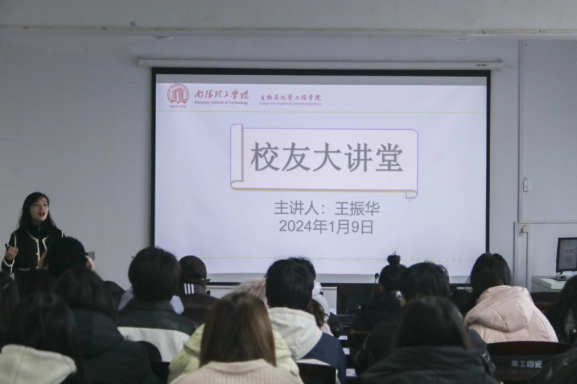 本网讯(学生通讯员/曹海贝 毛晨洁)1月9日,生化学院于9225举办校友大讲堂,由优秀校友王振华主讲,22级、23级出国班学生参加。生化学院陈瑞老师主持本次讲座。