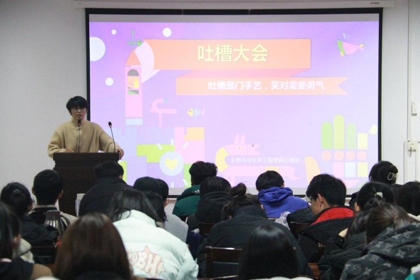 本网讯(学生通讯员/曹海贝 金邹钰 邵远恩)为引导同学们合理宣泄情绪,客观看待事物,11月16日,生化学院于9225会议室举办“吐槽大会”。学生会主席团担任评委,部分同学参加。