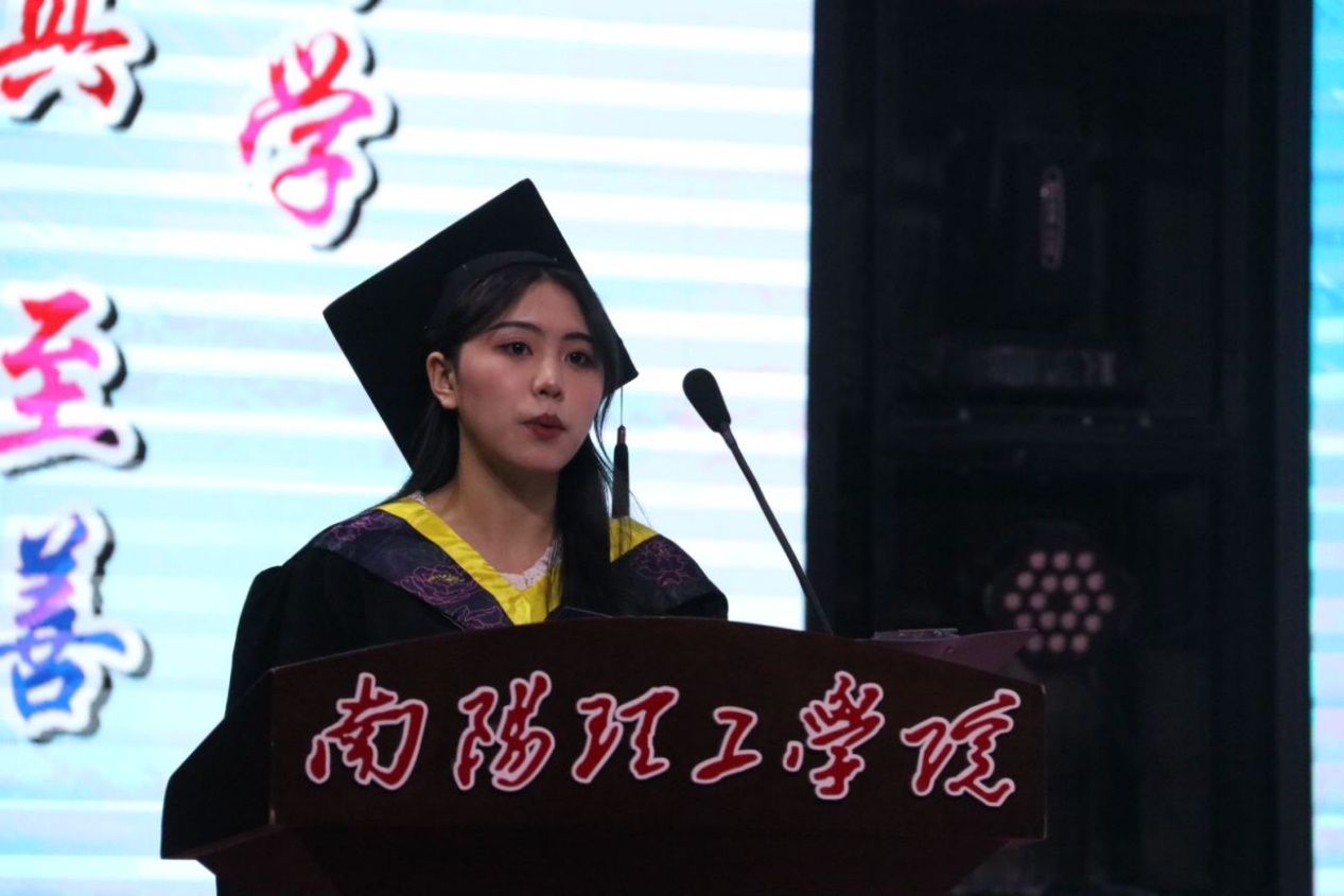 2022届优秀毕业生代表贺谣,她分享个人大学成长经历,现身说法,鼓励学弟学妹们多参加课外活动、多锻炼,在工作和学习中学会规划时间,在参与活动和服务同学中不断提高自己的综合能力。她通过风采录分别就应征入伍、考取研究生、创业三个方面分享了自己的经历,用亲身经历告诉学弟学妹们要设定自己每个阶段的目标,要敢于探索自己的未来。