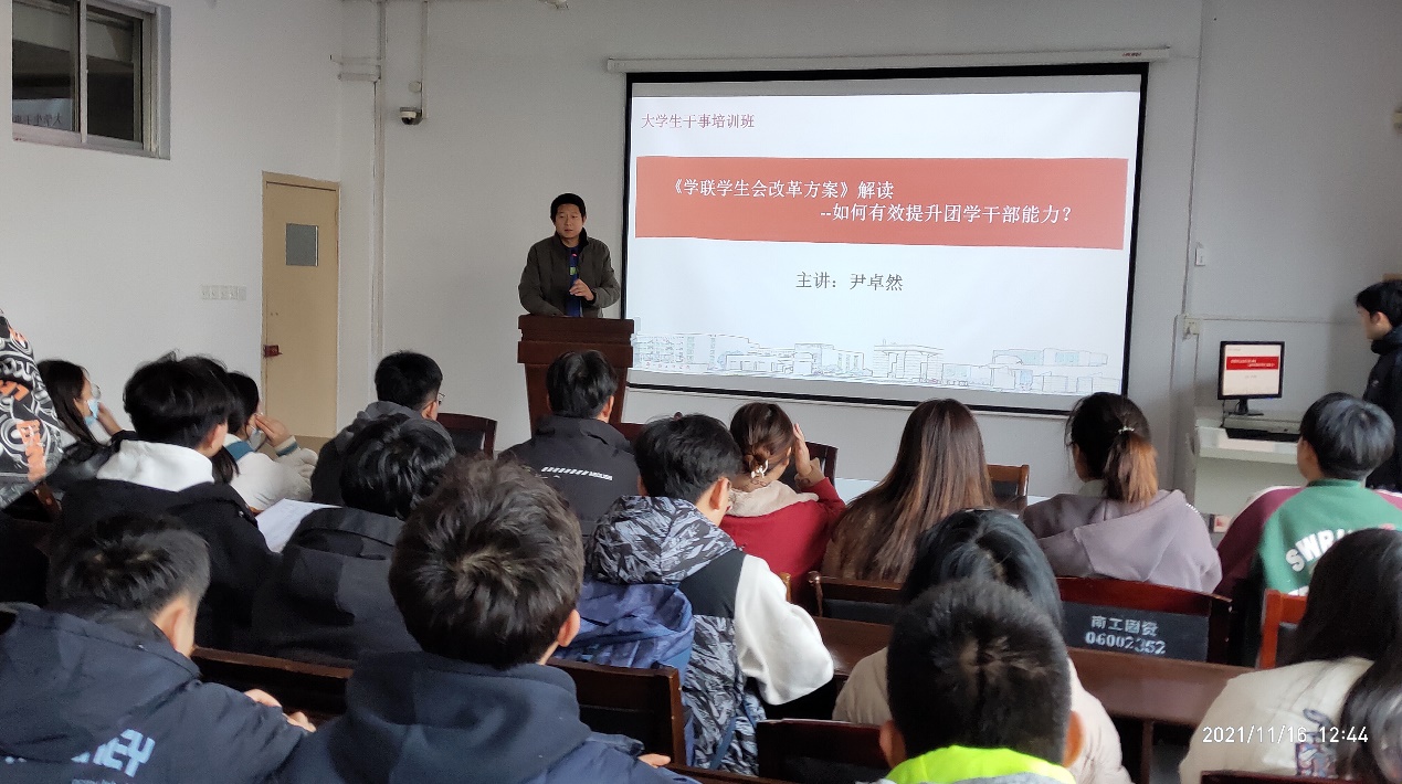 尹卓然对《学联学生会组织改革方案》进行解读并从改革方案的指导思想、基本原则、主要目标三个方面展开讲述,他指出要加强学联组织和学校学生会组织有关改革措施的落实工作,明确要求学联组织要完善党领导下、团指导下的各级学联组织体系,加强和改进思想政治引领,引导服务广大同学成才报国,改进学联组织运行工作体制,积极建设“网上学联”,同时要求学校学生会组织优化自身体系,改革完善学生代表大会制度,精简优化学生会组织结构,健全学生权益代表和维护机制,积极创新工作体制,规范学生干部的选拔、考核和培养,加强学生干部作风建设。最后尹卓然结合《十九大报告》内容给学生们提出几点要求,希望学生干部在时代中要担当责任,明确自身成长的方向和路径,牢牢把握实现中华民族伟大复兴中国梦而奋斗的时代主题,以学生为本,引导学生培养责任感和紧迫感,积极开展学生工作和活动。