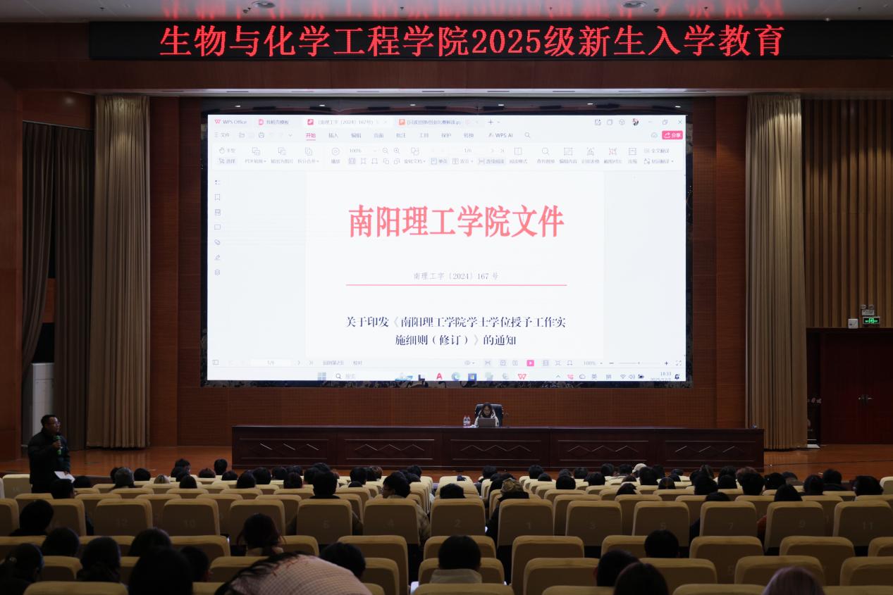 李慧星以《南阳理工学院学士学位授予工作实施细则(2025年修订版)》为依据,系统解读了学士学位授予的条件、程序及学位撤销相关规定。他结合学院近年人才培养成果与考研升学数据,引导新生尽早树立学业目标,合理安排大学四年的学习进程。讲座中,李慧星特别强调了实验室安全与学术诚信的重要性,并针对“不得授予学士学位”的七类情形,结合典型案例,深入剖析学术不端、考试作弊、严重违纪及学分未修满等行为的严重后果,为新生划清学业红线。此外,他还鼓励同学们积极参与学科竞赛、科研项目等实践活动,拓展综合素质与发展路径。