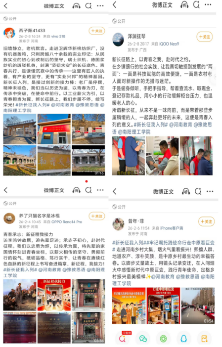 本次活动创新形式,依托新浪微博平台,组织学生积极参与“青春共行:新长征我入列”网络话题讨论。学院共有14名学子踊跃参与,围绕新时代中原发展成就与青年使命担当,共创作并提交了13份高质量实践作品。同学们以文字感悟、心得分享等形式积极发声,在交流讨论中深化思想认识、厚植家国情怀,涌现出各具特色、立意深远的优秀作品:有的同学回望工业遗存,写下“旧墙静立,老机默言。八十余载实业印记镌刻坚韧求实底色,我们以工业薪火为引,以青春担当为翼,在传承中续写实业兴邦荣光”的壮志豪情;有的同学追寻红色足迹,发出“访先辈足迹,承赤子初心,以忠勇为炬、以传承为翼,在赓续红色血脉的新征程上勇毅前行、接力奋斗”的热血誓言;还有的同学感悟文脉传承,表达出“古柏苍苍,文脉悠悠。三千年古建承载文化根脉,我们以历史为窗、以文化为笔,在坚守中创新,以青春之力守护华夏文明”的坚定信念。