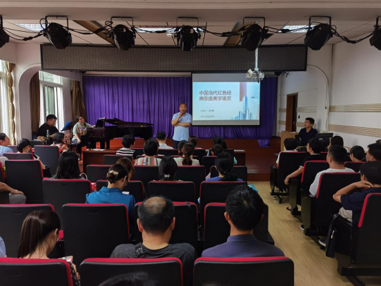 6月18日,宋宏群以“中国当代红色经典歌曲美学鉴赏”为题做学术报告。他对《十送红军》、《红军战士想念毛泽东》、《红星歌》等经典红色歌曲的背景故事、主题旋律等方面进行了详细讲解。他提到,红色经典歌曲是时代旋律,它伴随着伟大的党和祖国从诞生到成长,浓缩了峥嵘岁月的革命历史,蕴含了艰苦奋斗的优良传统。宋老师对红色经典歌曲解读精准、妙语连珠,博得了现场教师热烈掌声。