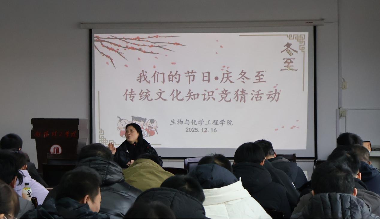 本网讯(特约记者/梁瀚余 学生通讯员/陈佳镓 胡天路)弘扬中华优秀传统文化,增强教职工的凝聚力和文化认同感,12月16日,生化学院于9225会议室举办“我们的节日•庆冬至传统文化知识竞猜”活动,全体教职工参加。
