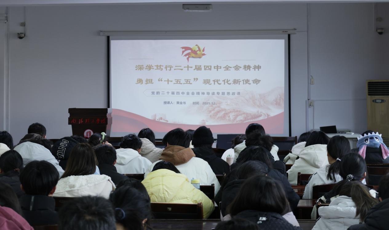 本网讯(特约记者/梁瀚余 学生通讯员/陈佳镓 陈语晴)12月16日,副校长黄金书以“深学笃行党的二十届四中全会精神 勇担‘十五五’现代化新使命”为主题,于生化学院9225会议室为生物与化学工程学院、张仲景国医国药学院部分2025级学生上了一堂生动思政课。
