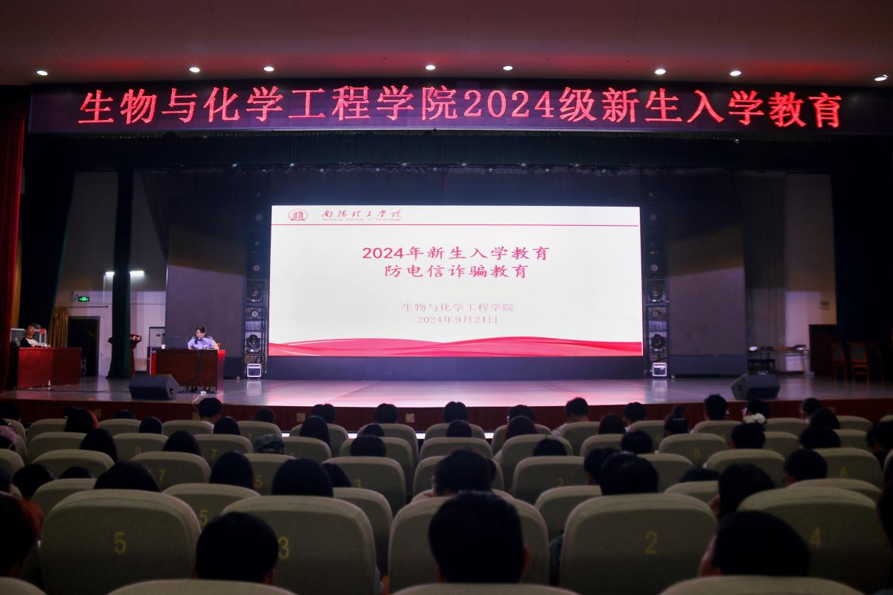 本网讯(学生通讯员/高原 张晴 杨豆豆)为增强新生的安全防范意识,有效预防各类电信诈骗,9月24日,生化学院于毕业大厅举办新生防诈骗活动,本次活动由枣林派出所警官戴星主讲,团学办主任张梦主持,2024级全体新生参加。