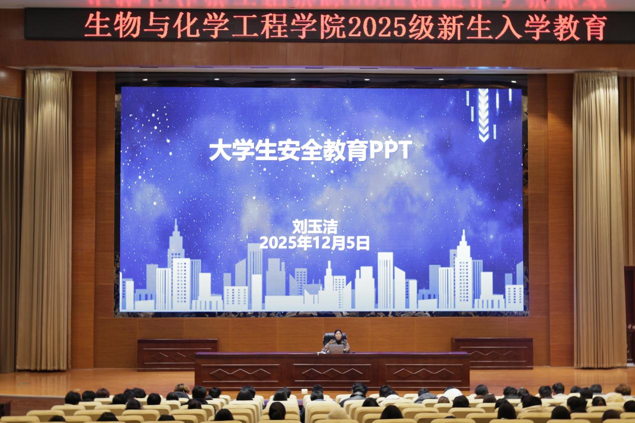 本网讯(学生通讯员/陈佳镓 胡天路)为加强学生安全意识,12月5日,生化学院于第三报告厅举办2025级新生安全教育主题讲座,本次讲座由学院党委副书记刘玉洁主讲,2025级全体学生参加。